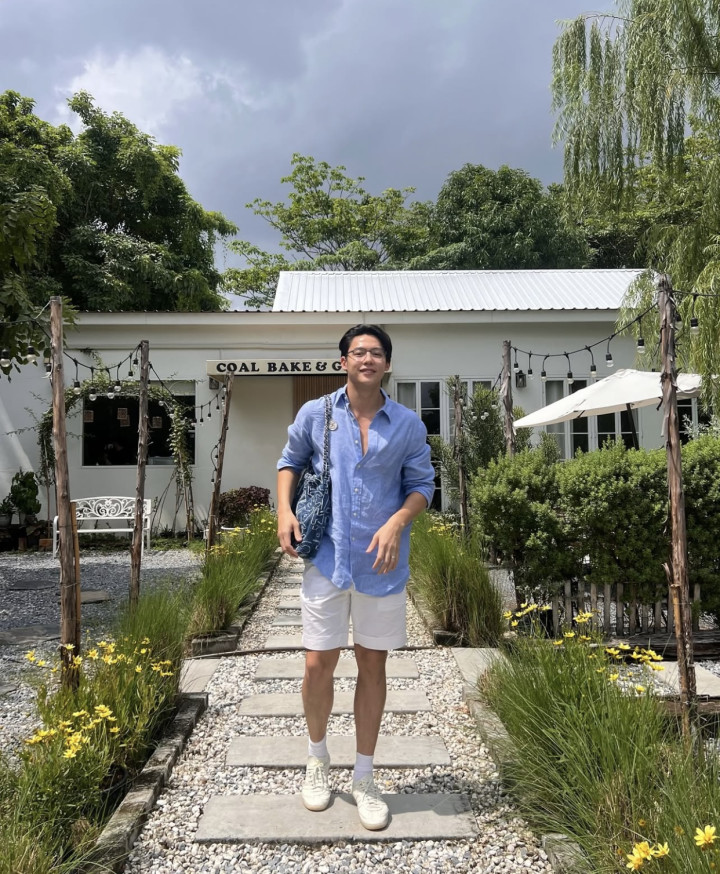 等到天气稍微再凉快一点,就可以把你的蓝色长袖衬衫给拿出来,蓝色和白色本身就是蓝天白云的颜色,这组颜色看上去非常清爽干净,而且会让人觉得你是一个很有活力的大男生。也记得短裤的长度不要太长,不然看上去就显得有些拖沓了。